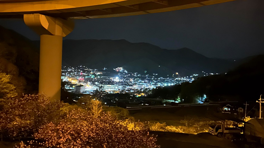 夜景を見るにはこの公園の先にある展望台駐車場からの眺めの方がきれいですが、ここからもループ橋の間に高梁市街地の夜景が見えます。
