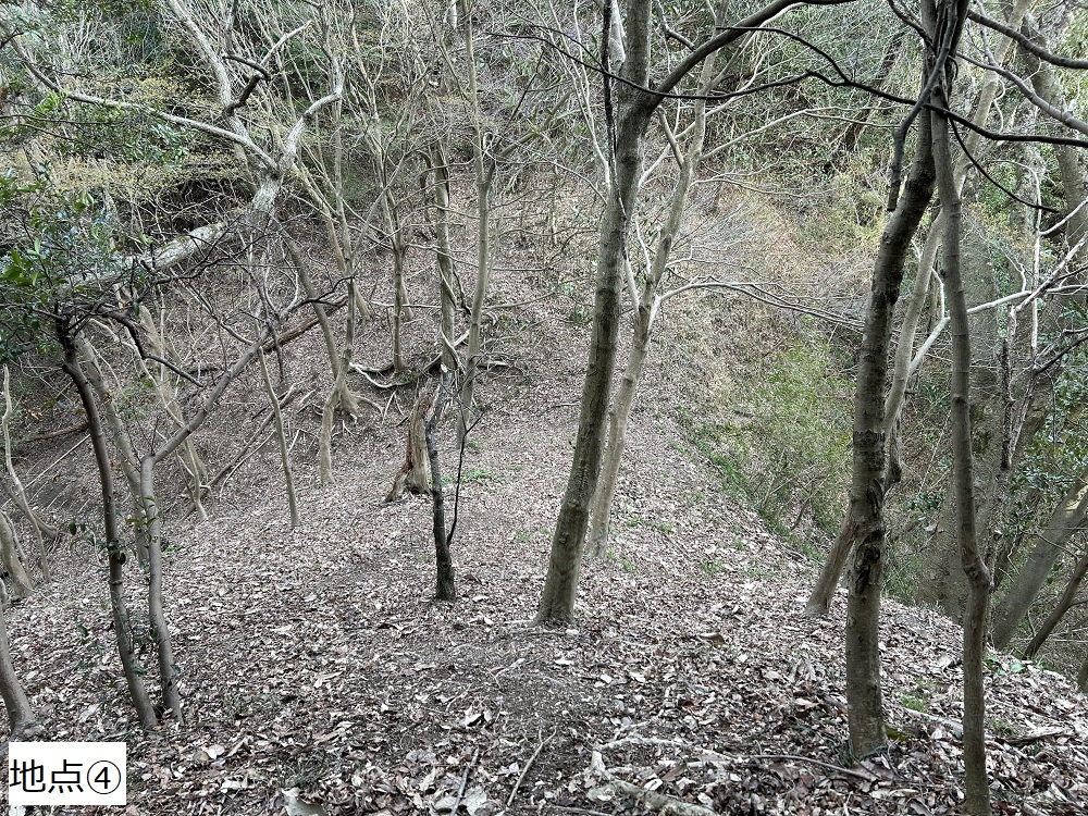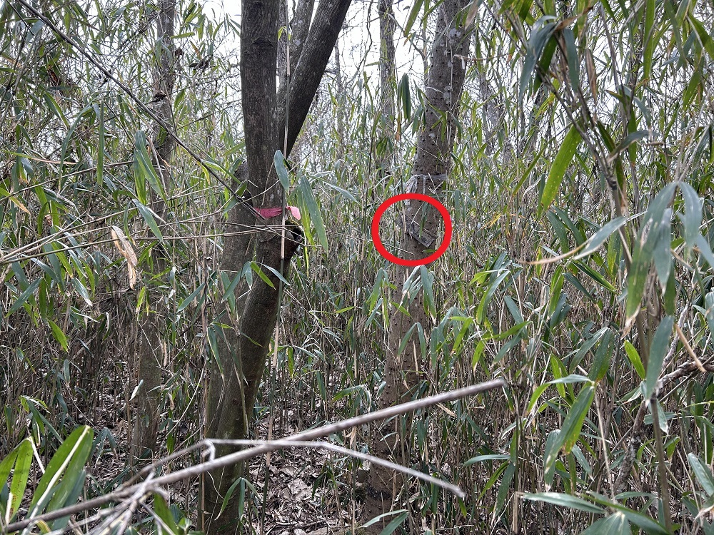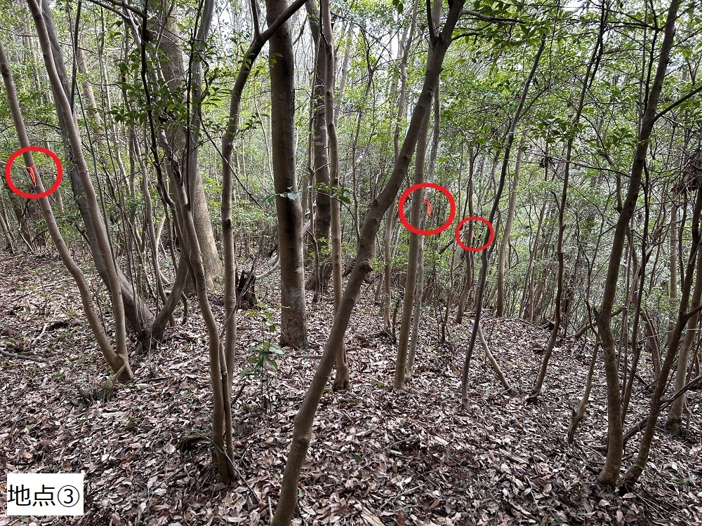 鉄塔から尾根沿いを6~700m進んだところから尾根からはずれ、北西へ進みます(地点③)。木に赤いテープがくくりつけてあるので、それを頼りに進みます。