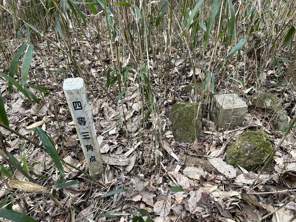 鞍部から最も高いところを目指していきます。山頂付近は笹藪で進むのにも苦労しますが、高いところを目指していくと三角点があります。三角点からの眺望はほぼありません。