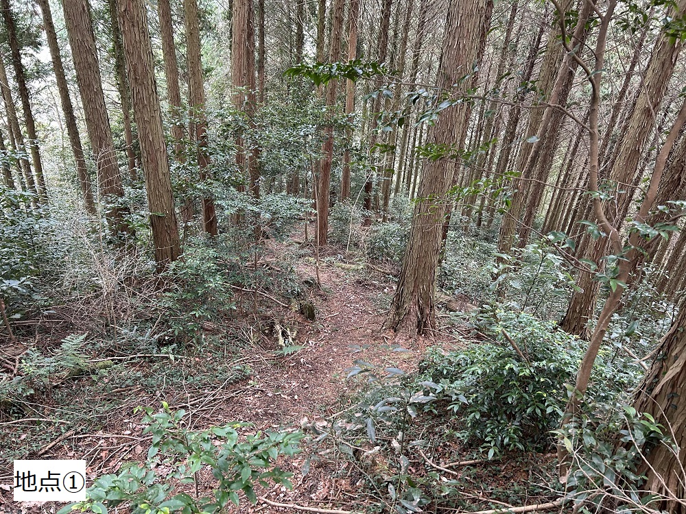 国道484号から山道を登ります。途中からヒノキ林(地点①)になります。
