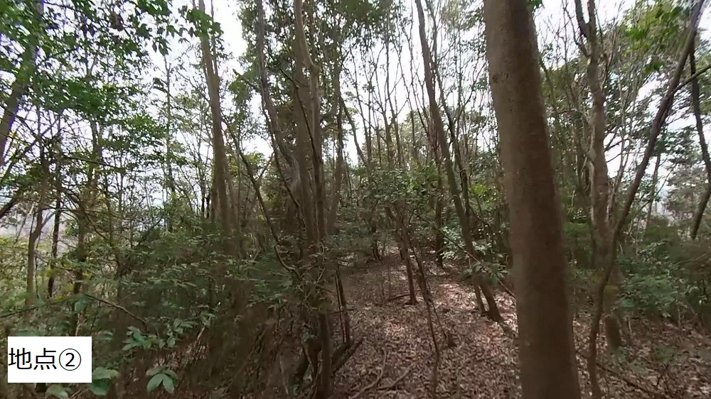 鉄塔から先は尾根沿いに歩くので、あまり高低差はなく、歩きやすいです。ただし、道は鉄塔までと比べると細くなります(地点②)。