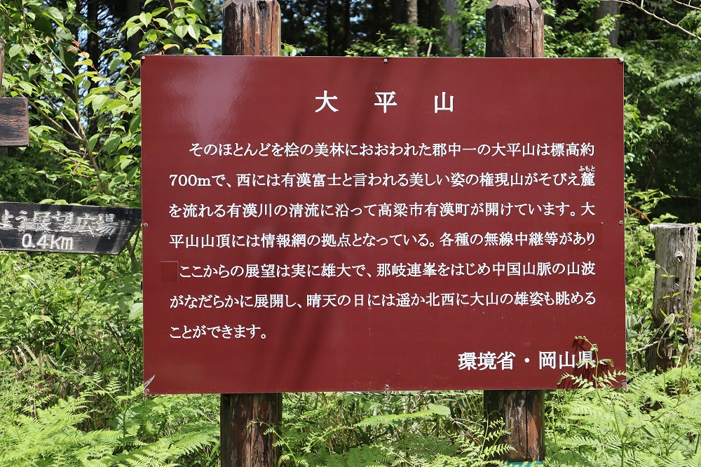 大平の森への分かれ道を過ぎ、そのまま進むと、「大平山展望台」と「大平山生活環境保全林」との分かれ道に着きます。大平山展望台方向へ進みます。途中には吉備中央町の天福寺へ行く分かれ道がありますが、そのまままっすぐ進みます。