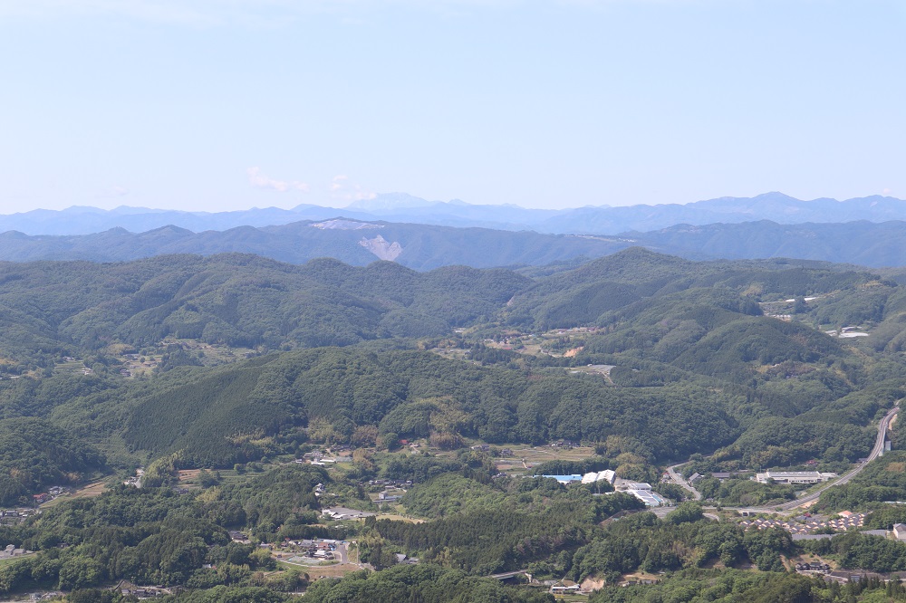 展望台は円形で双眼望遠鏡がありますが、現在は使えません。この展望台ができたのが昭和の終わりごろ。できて40年近くになります。景色は素晴らしく、下には農村公園が、遠くには中国山地や大山?が見えます。